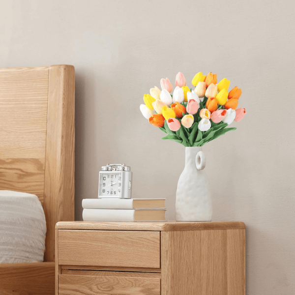 Unlike fresh flowers, these real-touch faux tulips require no watering or sunlight, making them a low-maintenance choice for both home and event decoration.