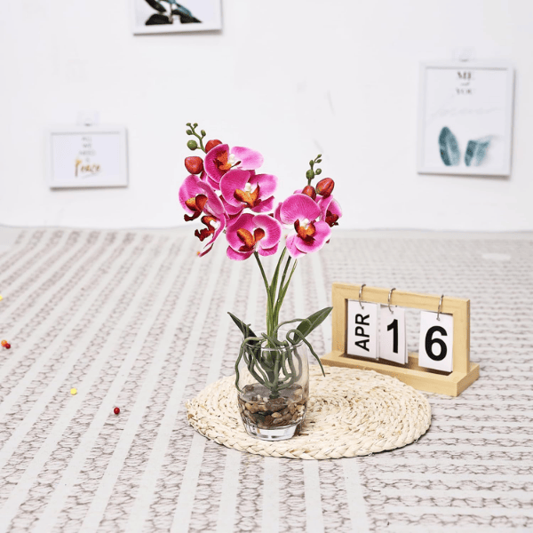 Add a touch of natural beauty to your space with this 14.5-inch Purple Artificial Orchid in a clear glass vase. The vivid Phalaenopsis flowers and lifelike green leaves are crafted from high-quality plastic for a realistic look and long-lasting freshness. The elegant glass vase includes decorative small stones, creating a modern and stylish centerpiece. Perfect for home, office, bathroom, or bedroom décor, this faux orchid adds sophistication and color to any setting — no watering or maintenance required.